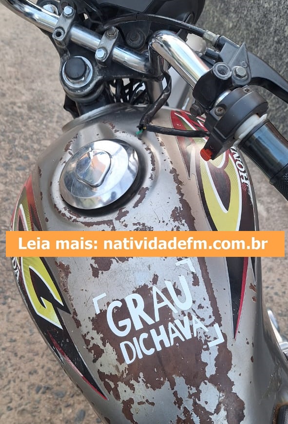 Por volta das 17:30h, durante deslocamento pela Rua Pedro Lopes de Oliveira, próximo ao DPO da Polícia Militar, bairro Boa Vista, os agentes se depararam com uma motocicleta (Honda CG 125 titan ES, cor prata) extremamente barulhenta, sem documentos, com placa feita de PCV, conduzida por adolescente de 14 anos, que alegou ter adquirido o veículo de uma pessoa de Natividade, através de uma barganha.