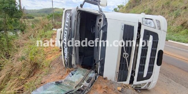 Uma carreta carregada com 30 mil litros de leite tombou na tarde desta quarta-feira (22), na BR-356, em Itaperuna, próximo ao trevo de Bom Jesus do Itabapoana.
