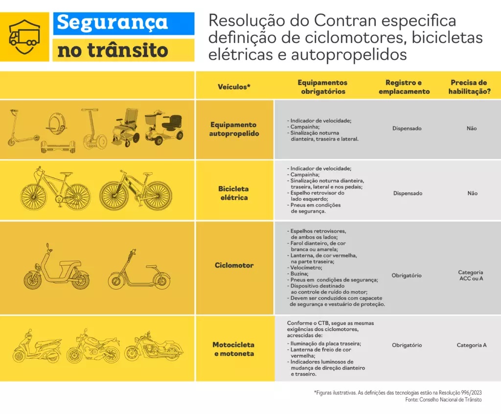 A crescente confusão entre os diferentes tipos de veículos elétricos fez o Conselho Nacional de Trânsito (Contran) publicar a Resolução nº 996/2023, que define claramente o que é considerado bicicleta elétrica, ciclomotor ou equipamento autopropelido (como patinetes e skates motorizados)