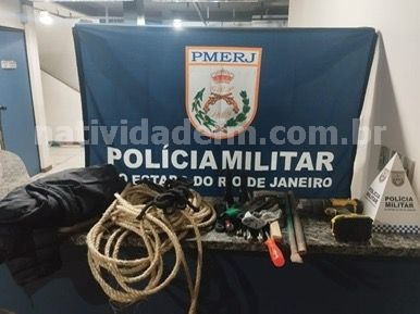 Durante a verificação no local, os policiais militares encontraram e apreenderam diversos materiais que teriam sido utilizados na ação criminosa, como ferramentas, cordas, luvas e lanternas.