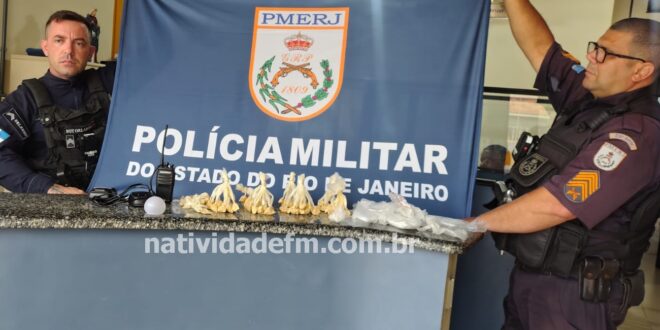 Militares do 29º BPM apreenderam cerca de 120 papelotes de cocaína, material de endolação, além de um radiotransmissor na tarde desta segunda-feira (24), no bairro Tubiacanga, Natividade.
