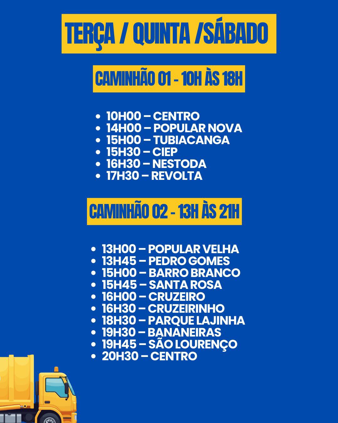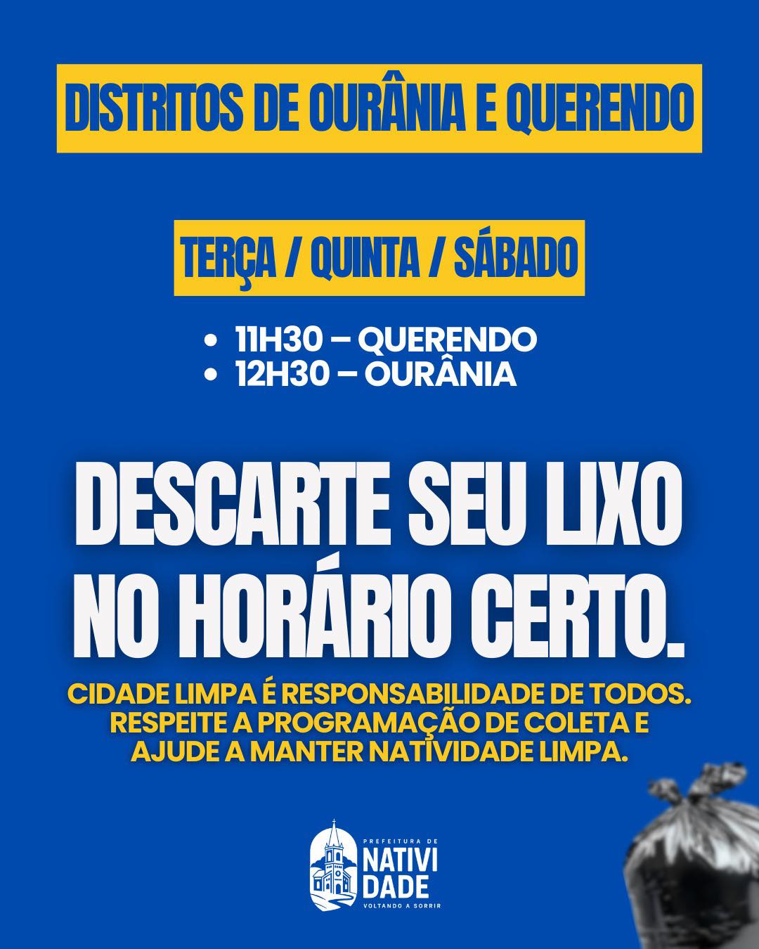 A Prefeitura de Natividade divulgou na tarde desta segunda-feira (05), o cronograma com dias e horários de coleta de lixo domiciliar, nos bairros, distritos e zona rural.