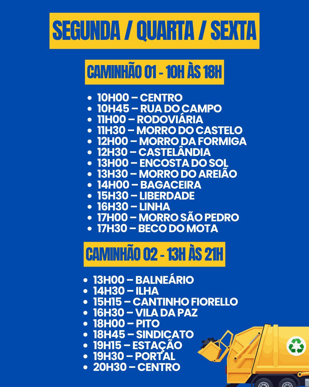 De acordo com o governo, uma nova companhia assumirá a execução das atividades, com dois caminhões-prensa, que com recolhimento previsto no horário compreendido de 10h às 21h. VEJA: