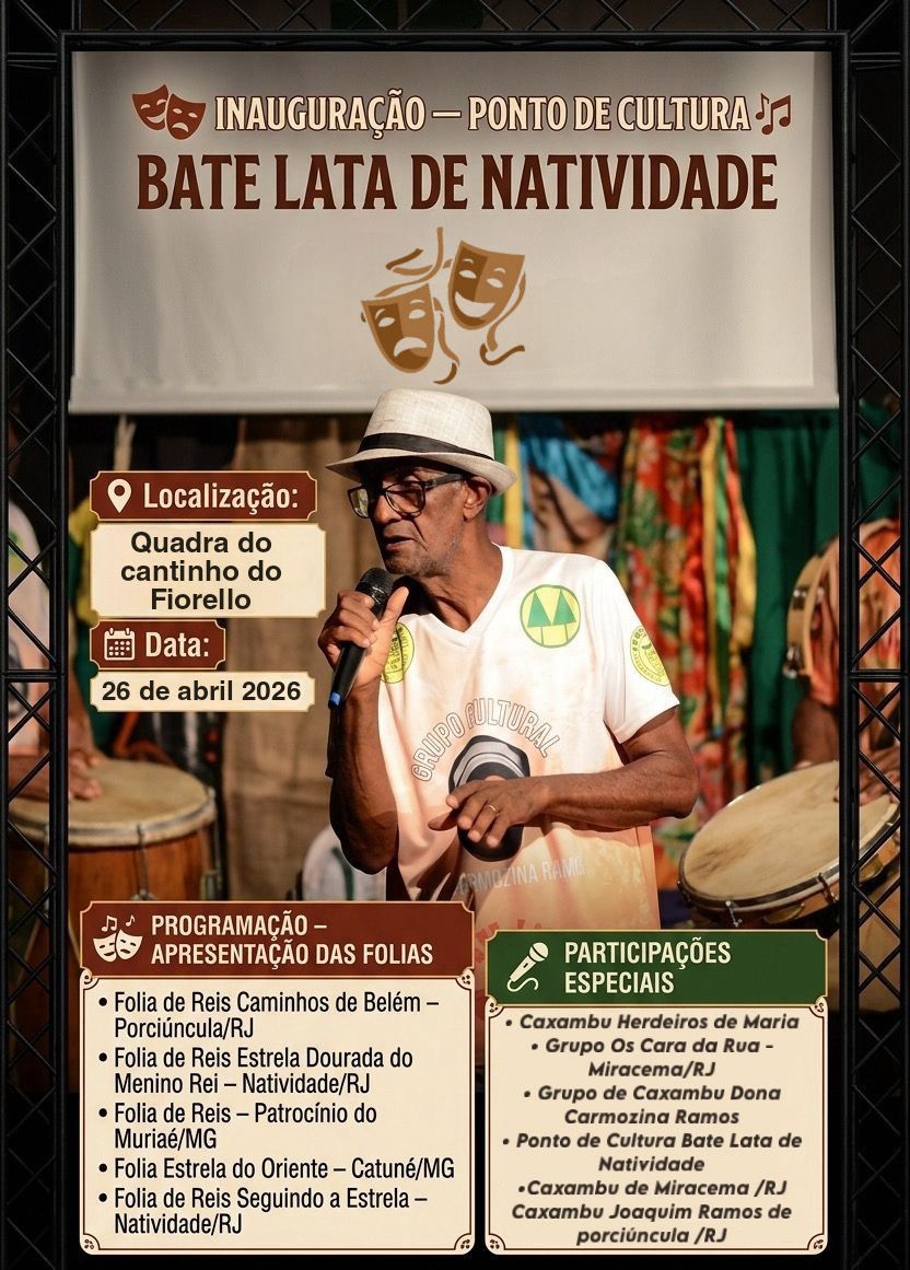A cidade de Natividade se prepara para dar mais um passo em sua trajetória cultural. No próximo dia 26 de abril, acontece a inauguração oficial do Ponto de Cultura Bate Lata de Natividade. O evento celebra o reconhecimento recente do grupo como um dos Pontos de Cultura oficiais do Estado do Rio de Janeiro, uma chancela que coroa anos de dedicação à preservação das tradições locais e ao trabalho social.